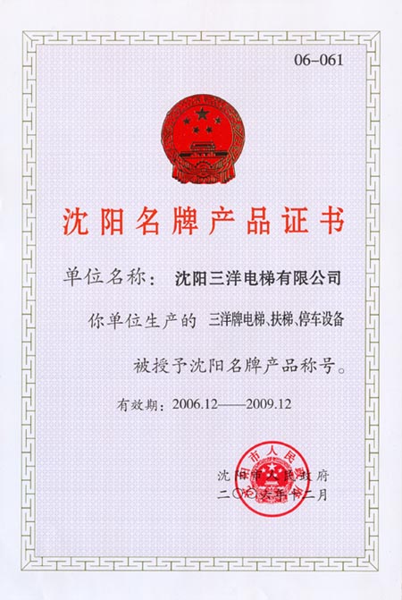 在沈陽市名牌產品戰(zhàn)略工程領導小組于2006年3月20日開始組織的沈陽名牌產品評審工作中,沈陽三洋電梯有限公司生產的電梯、扶梯、停車設備,再次被命名為沈陽名牌產品。下圖是沈陽市人民政府頒發(fā)的沈陽名牌產品證書。